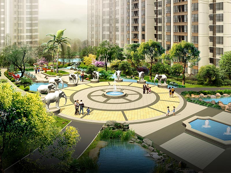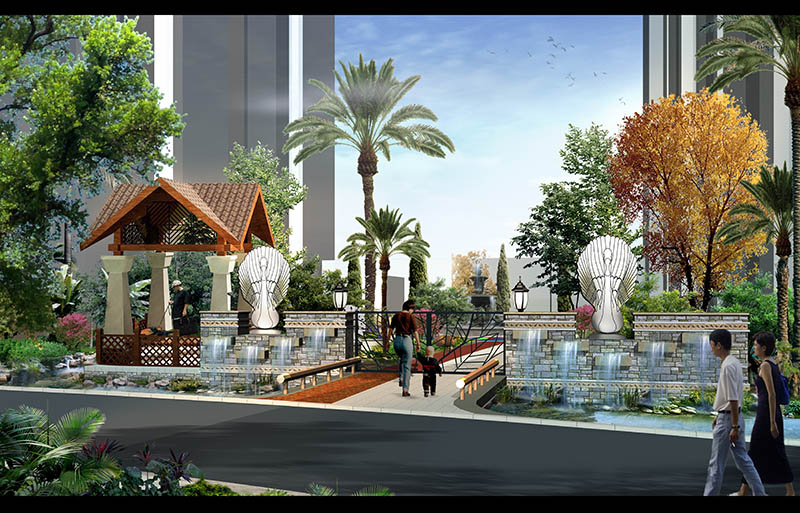噴泉、神獸泉等多種水景景觀妝點園區,賦予園區生動的氛圍和聲響;采用硬質景觀點題,在主要節點設計神獸雕塑、花臺、燈飾、陶藝等小品突出東南亞特點,
